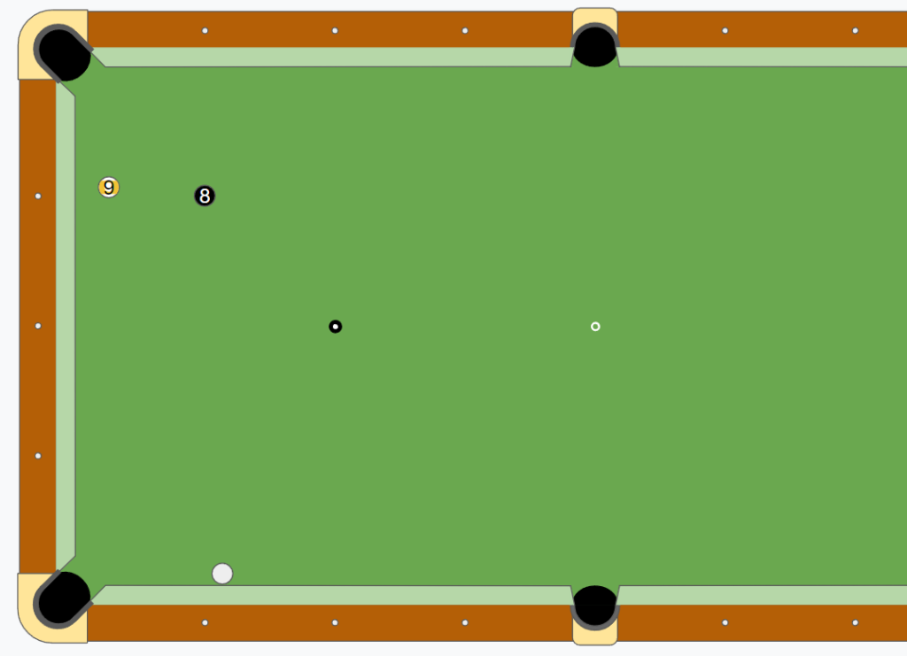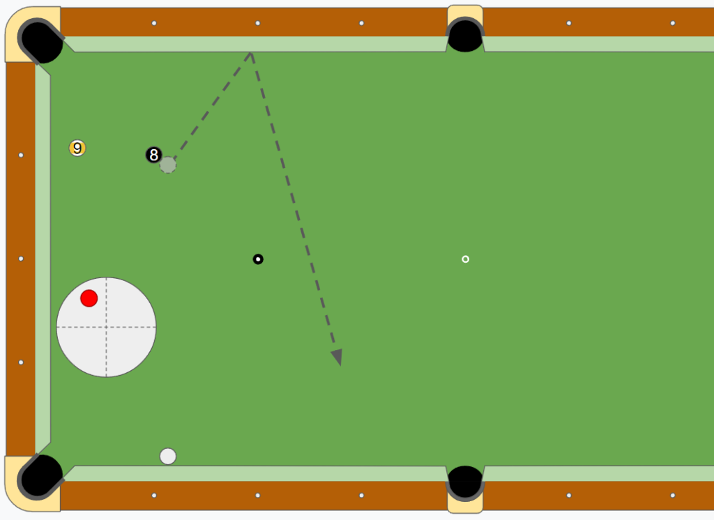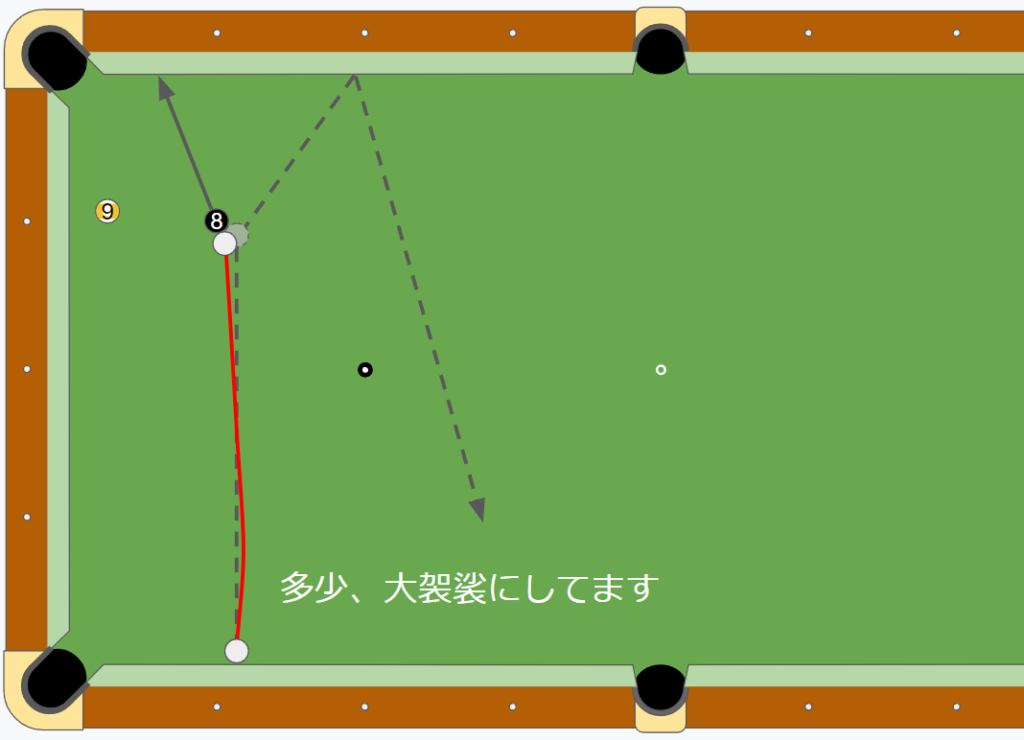 9ボールが遠くなった場合のイレの自信もないので、台の左半分に残すつもりで、少々左をひねるわけです。