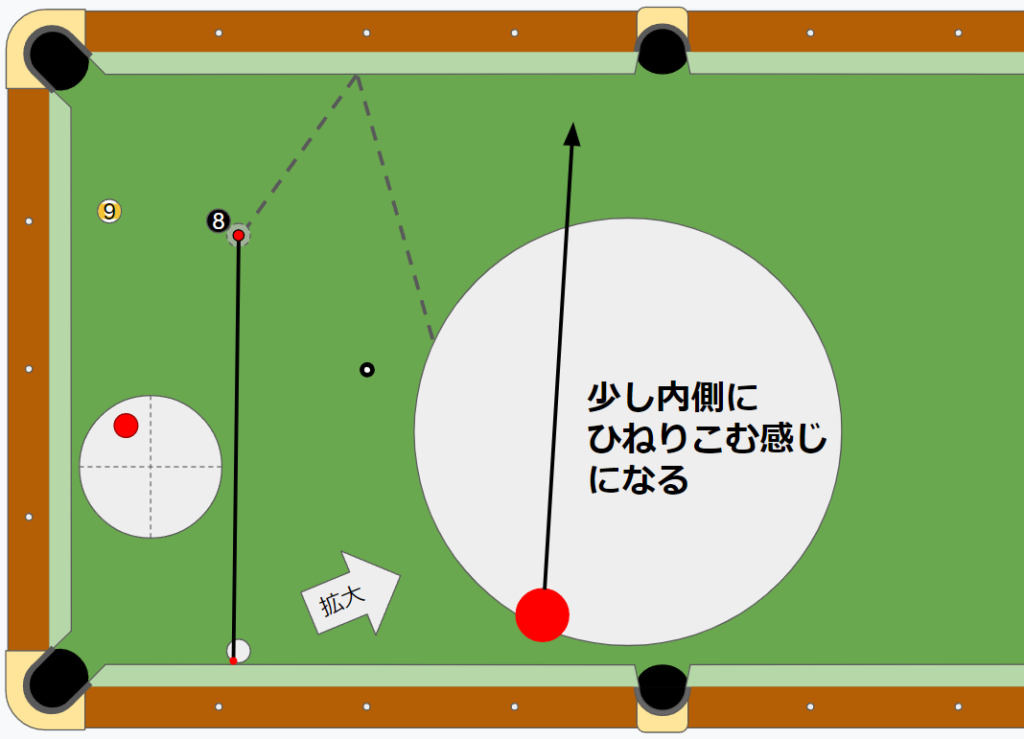 (ハイテクシャフトでの平行ずらしでのひねり前提。イメージボールはキュー特性とショットスピードに合わせてちゃんと見越せているという状況)