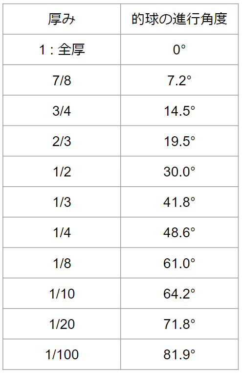 この計算によって得られる厚みと的球の進行角度の関係をいくつか選んで表にすると以下のようになります。