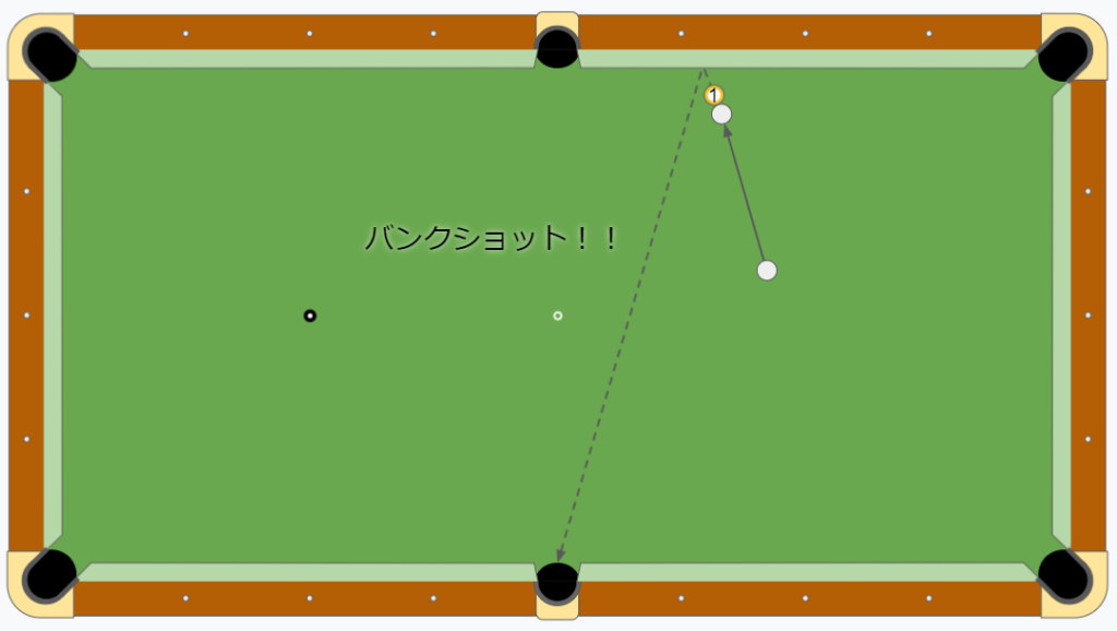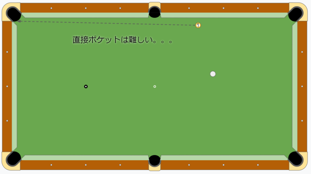 上のような配置だと、1ボールをサイドポケットに直接ポケットさせること狙うのは不可能です。また、コーナーポケットを狙うことはできますが、的球からポケットまでが遠く、厚みも非常に薄いため、非常に難しい球になっています。