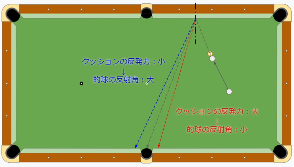 クッションのゴムの反発力が大きいときには的球の反射角が小さくなり、反対にクッションのゴムの反発力が小さい場合には的球の反射角が大きくなります。