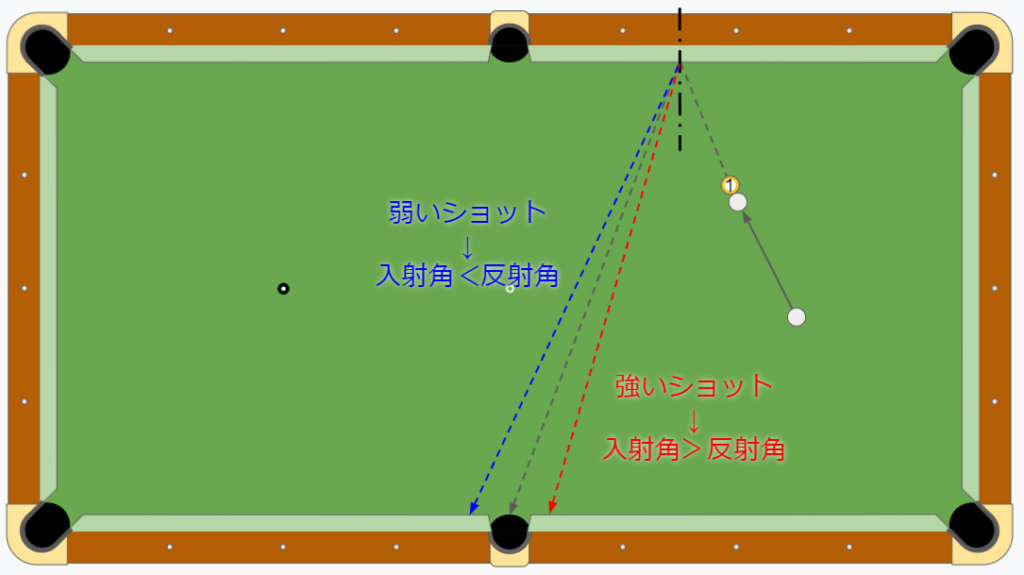 強くショットすると的球が速くなるので、クッションからの跳ね返りが強くなり、反射角が小さくなります。