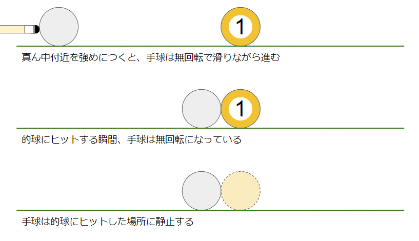 手球が的球にヒットしたときに手球に残っている回転によってその後の手球の挙動が変化します。