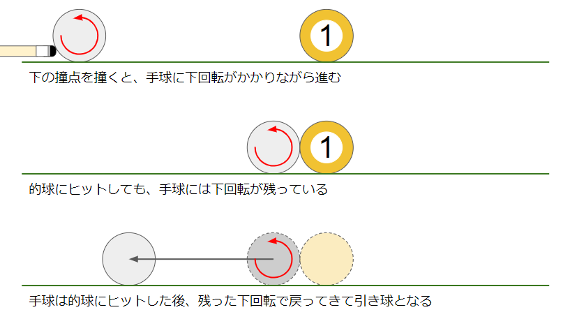 つまり、例えば下の撞点を撞いて引きの回転をかけたとしても、的球との距離がある場合などではこの摩擦によって的球とのヒット時に手球の回転がなくなり、引き球にならない場合があるということです。