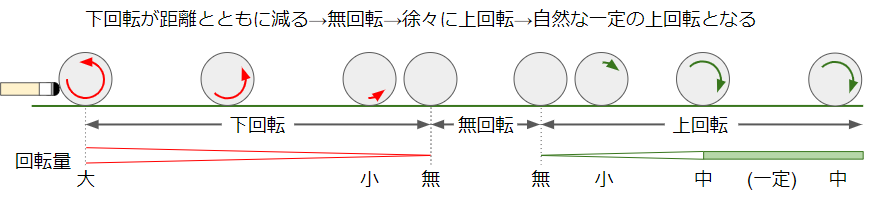 手球はラシャの上を転がっていく間に摩擦によって徐々に上回転がかかっていきます。