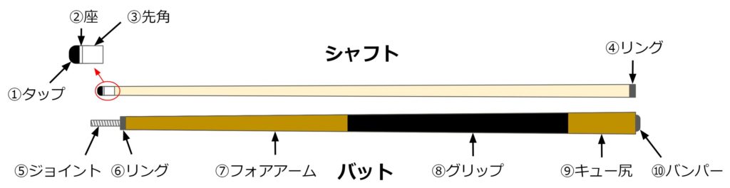 キューは真ん中で2つのパーツに分解できる2ピースキューが主流でほとんどがこのタイプです。